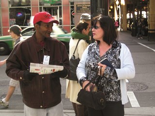 “Get your StreetWise from the world’s greatest vendor!” Russell shouts as potential customers walk by.