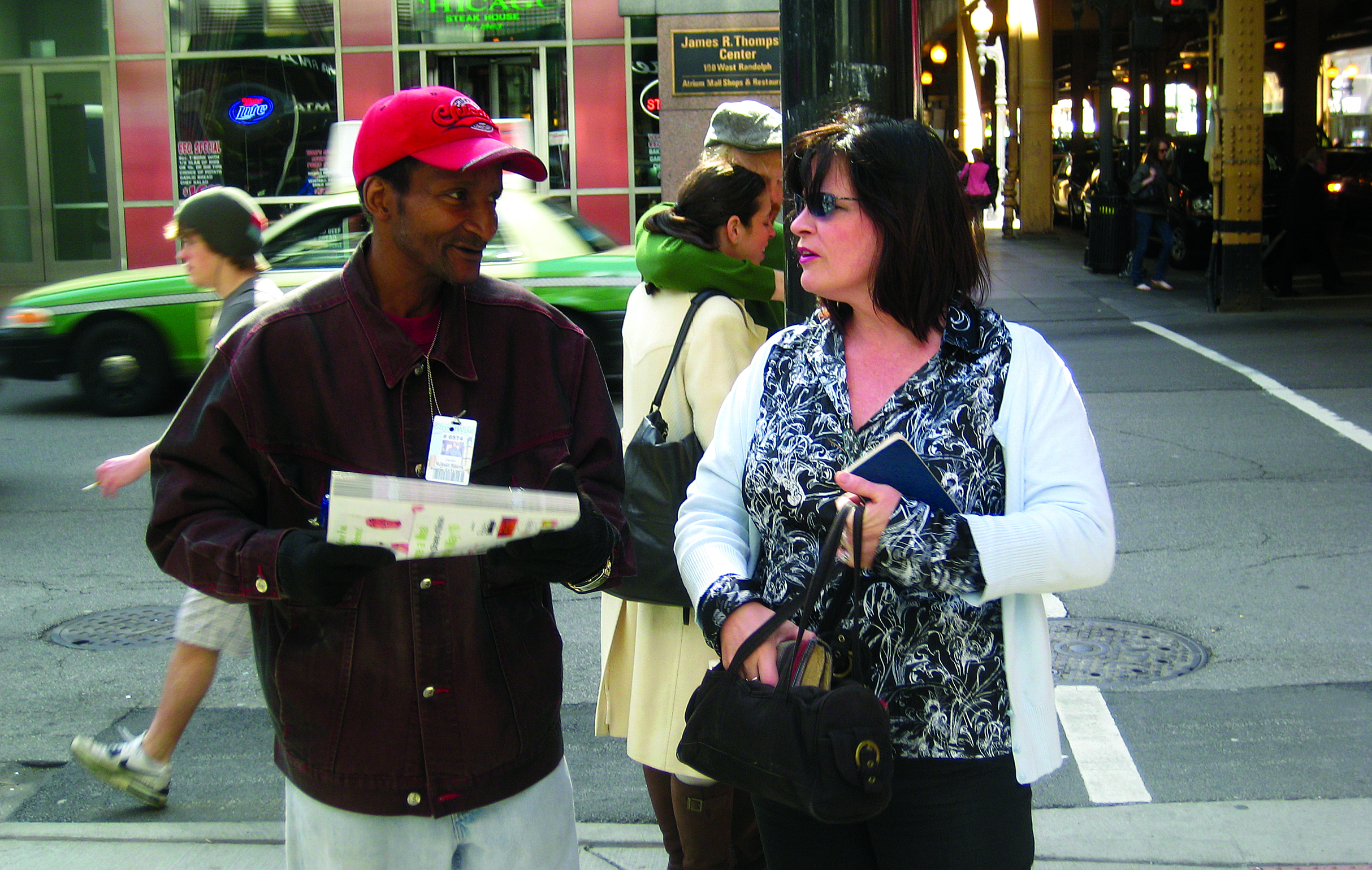 Around 1 p.m., Russell packs up his remaining magazines and heads up north to the StreetWise offices in Uptown, where he has another part-time job cleaning and emptying trash cans. On Tuesdays (is this the right day?) he makes his way to Uptown a little earlier to record the weekly SportsWise column with fellow vendors Vince Callaso and John Hagan.